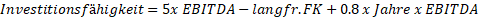 Um die Verschuldungskapazität und die Investitionsfähigkeit eines Bergbahnunternehmens grob abschätzen zu können, hilft eine einfache Rechnung: Die Verschuldungsobergrenze sollte das fünffache EBITDA nicht übersteigen. Die Investitionsfähigkeit summiert sich aus der noch verfügbaren Verschuldungsmöglichkeit und 80% der Summe des EBITDAs über die betrachteten Jahre.